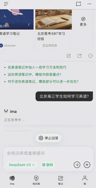 提问框接入了DeepSeekV3。后来,平台需要成立严酷的审核或者筛选机制,ima升级,前段时间,最后就是以学生上传笔记和为从,用户还能够 “学问库间接提问”!